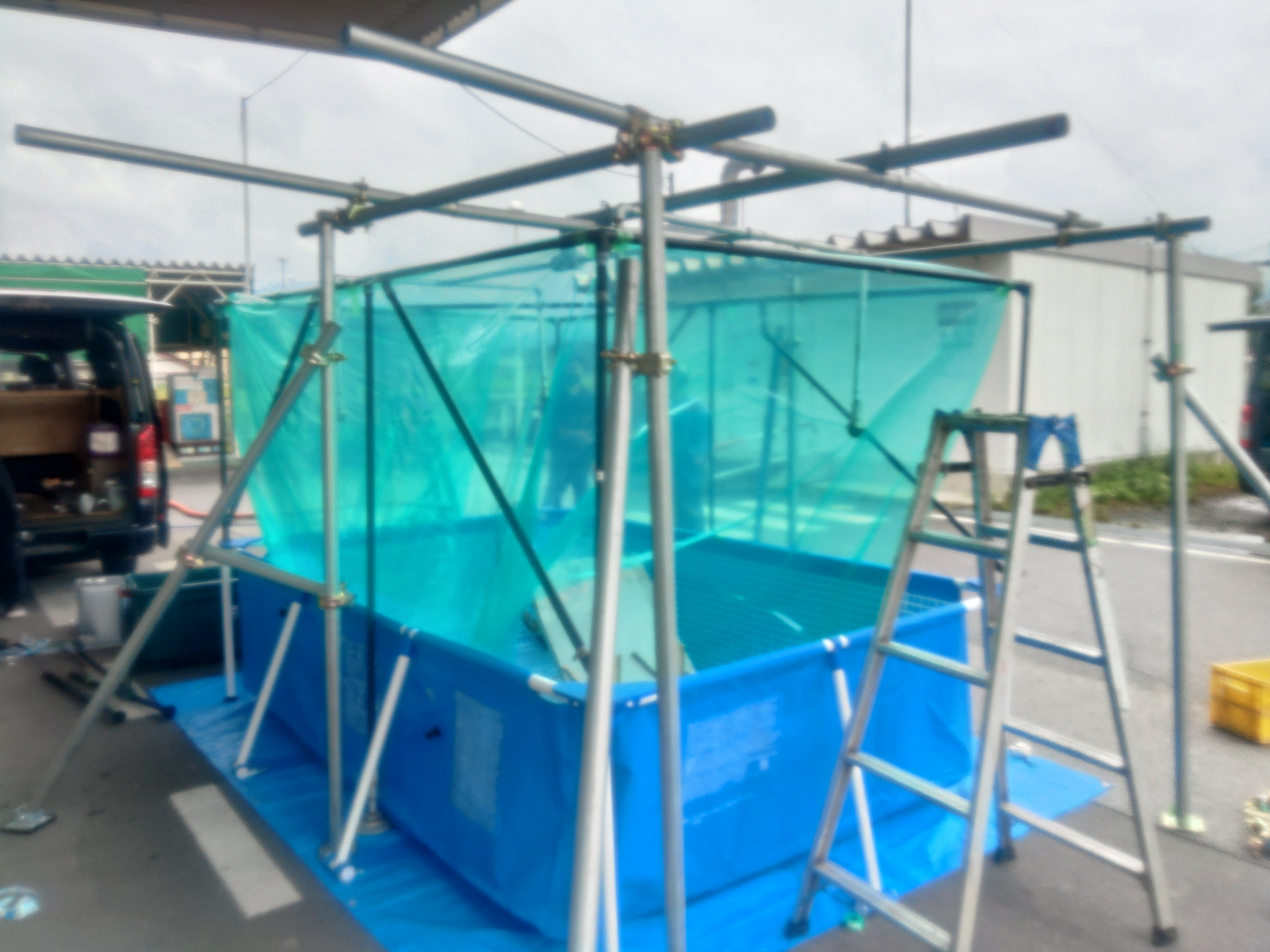 弊社では泡消火放射試験をより簡潔にすばやく放射の際に泡が飛び散らないように組み立て式簡易プールを 作成しました。放射後の撤去も通常よりすばやく行うことができます。 専用のギアポンプでプール内の水溶液もすばやく排出可能です。