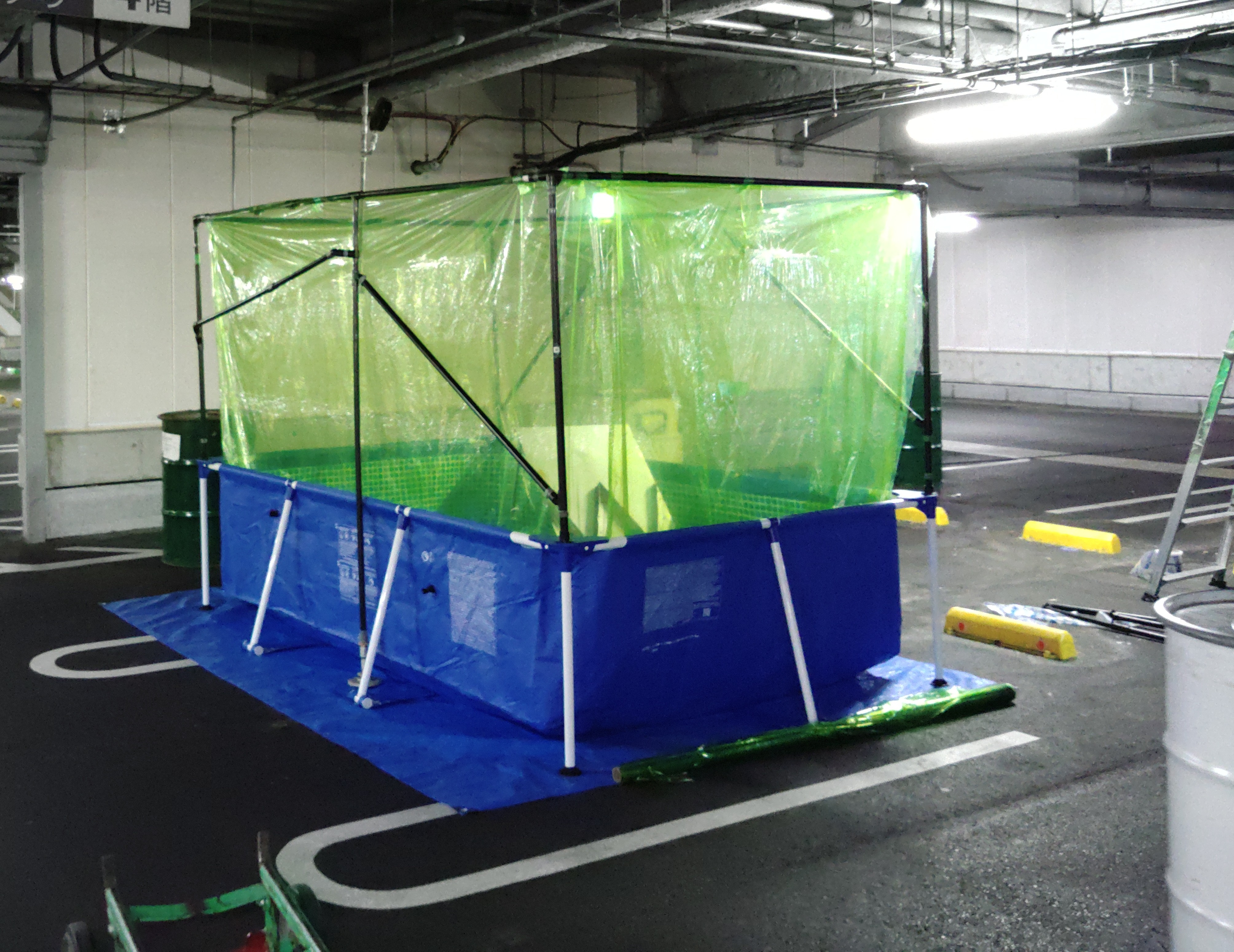 泡消火設備放射試験(せまいスペースで放射泡が飛び散らない組み立て式簡易プール)