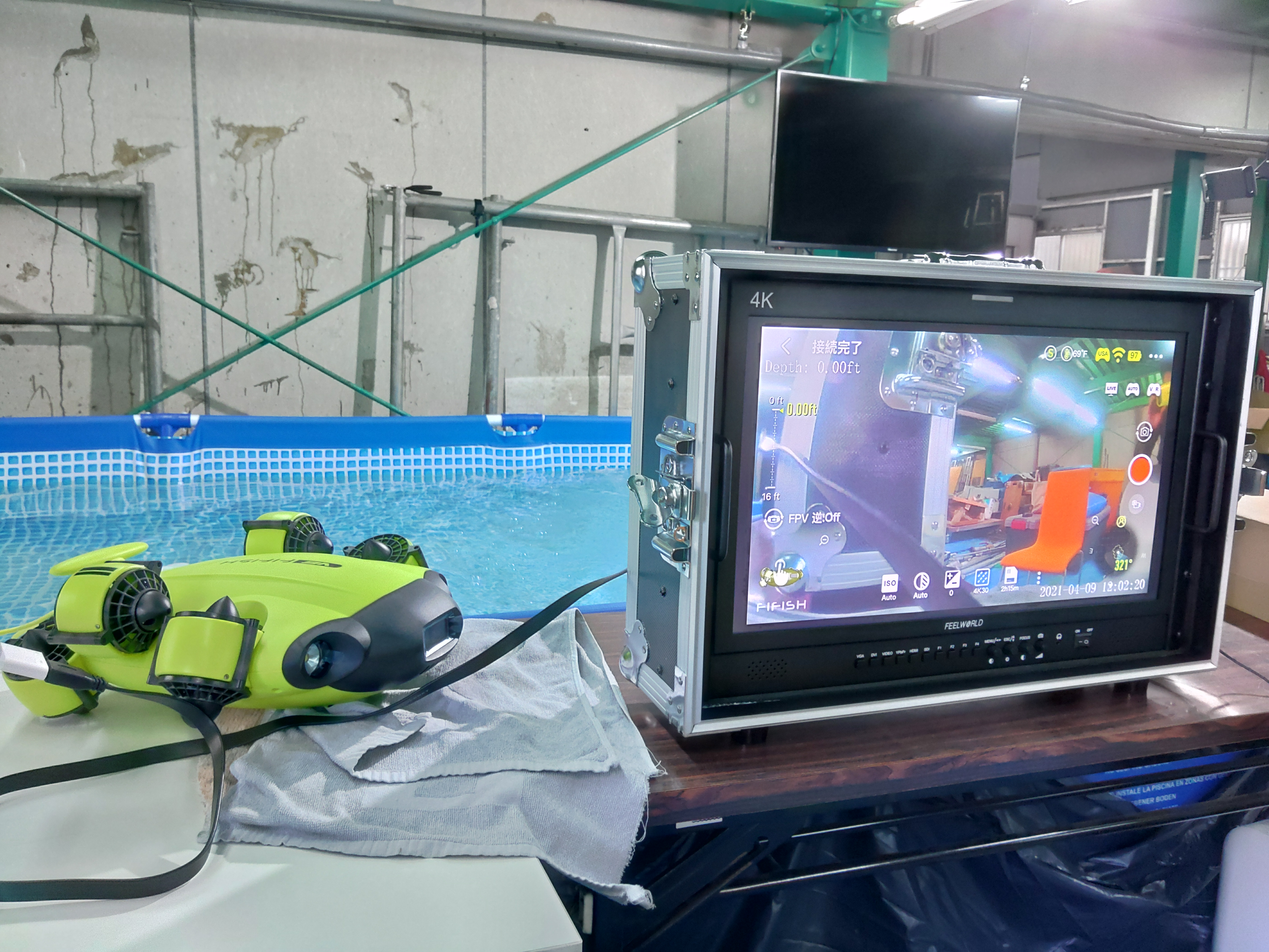 ・弊社では主に消火設備に伴うポンプ下の消 火水槽の点検、調査のために水中ドローンを使用しております。